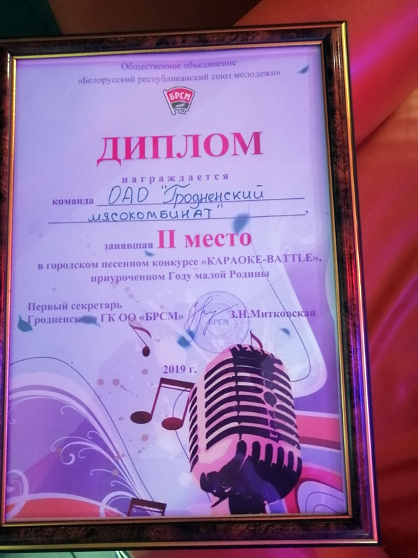 30 августа 2019 года команда ОАО «Гродненский мясокомбинат» приняла участие в конкурсе-караоке, организованном ГК ОО «БРСМ» для союзной молодёжи организаций, предприятий, учреждений города, приуроченному Году малой Родины в развлекательном центре «Галактика».